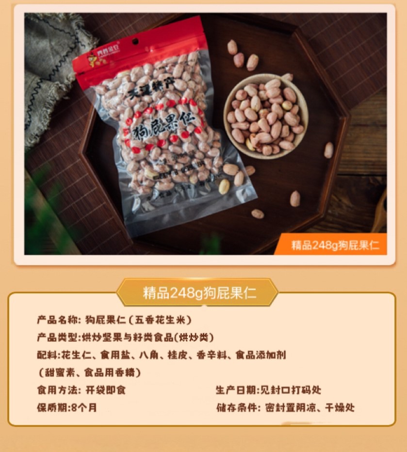 产品名称: 狗屁果仁(五香花生米) 产品类型: 炒货坚果与籽类食品(烘炒类) 配料:花生仁、食用盐、八角、桂皮、香辛料、食品添加剂(甜蜜素、食品用香精) 致敏物质信息:本产品含有花生,对花生过敏者慎用 食用方法: 开袋即食 生产日期: 见喷码处 保质期: 8个月 储存条件: 密封置阴凉、干燥处