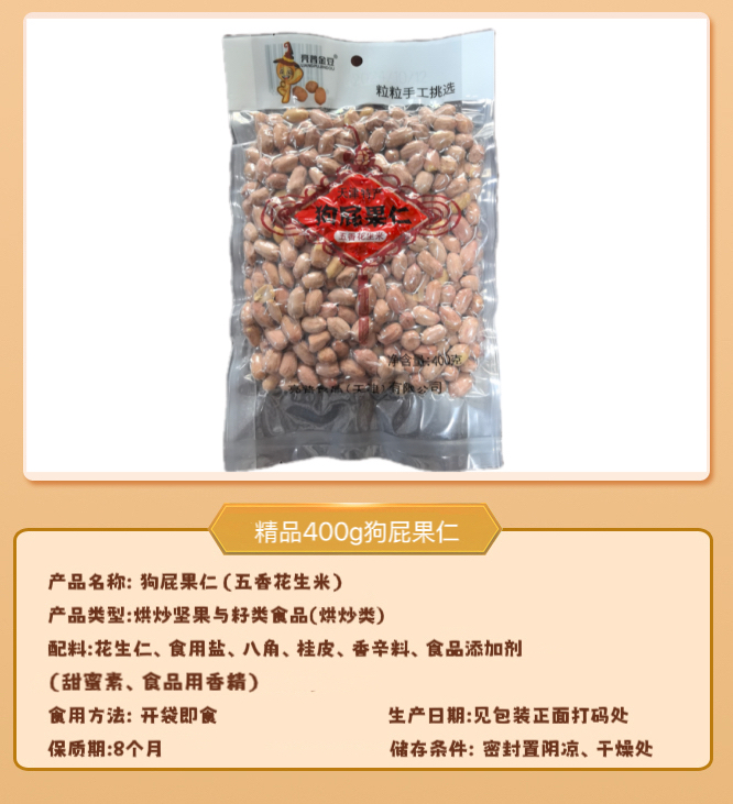 炒货食品及坚果制品(烘炒类)产品类型:炒货坚果与籽类食品(烘炒类) 配料:花生仁、食用盐、八角、桂皮、香辛料、食品添加剂(甜蜜素、食品用香精) 致敏物质信息:本产品含有花生,对花生过敏者慎用 食用方法: 开袋即食 生产日期: 见包装正面打码处 保质期: 8个月 储存方法:密封置阴凉、干燥处