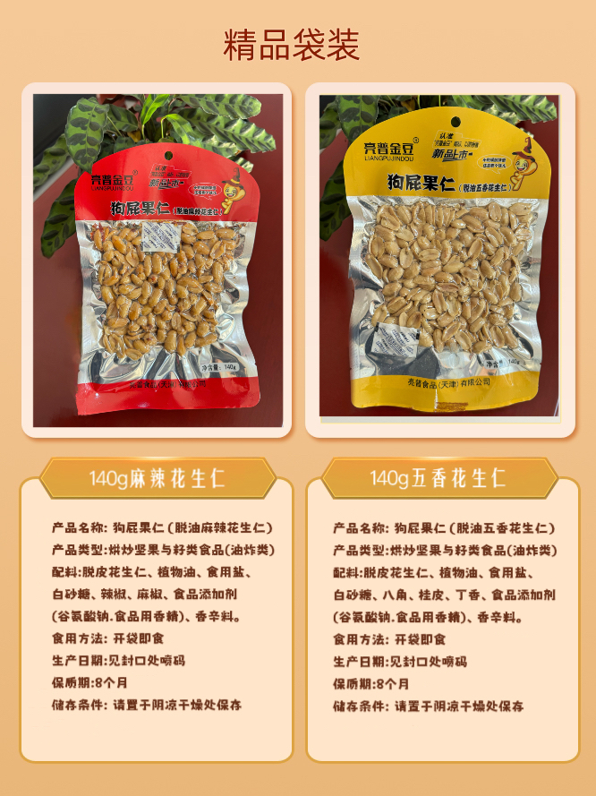 品名称:狗屁果仁(脱油麻辣花生仁) 产品类型: 烘炒坚果与籽类食品(油炸类) 配料:脱皮花生仁、植物油、食用盐、白砂糖、辣椒、麻椒、食品添加剂(谷氨酸钠.食品用香精)、香辛料。 食用方法:开袋即食 生产日期:见封口处喷码 保质期:8个月 储存条件:请置于阴凉干燥处保存