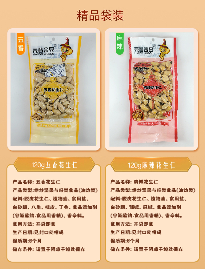 产品名称: 麻辣花生仁 产品类型: 烘炒坚果与籽类食品(油炸类) 配料:脱皮花生仁、植物油、食用盐、白砂糖、辣椒、麻椒、食品添加剂(谷氨酸钠.食品用香精)、香辛料。 食用方法: 开袋即食 生产日期: 见封口处喷码 保质期: 8个月 储存条件: 请置于阴凉干燥处保存