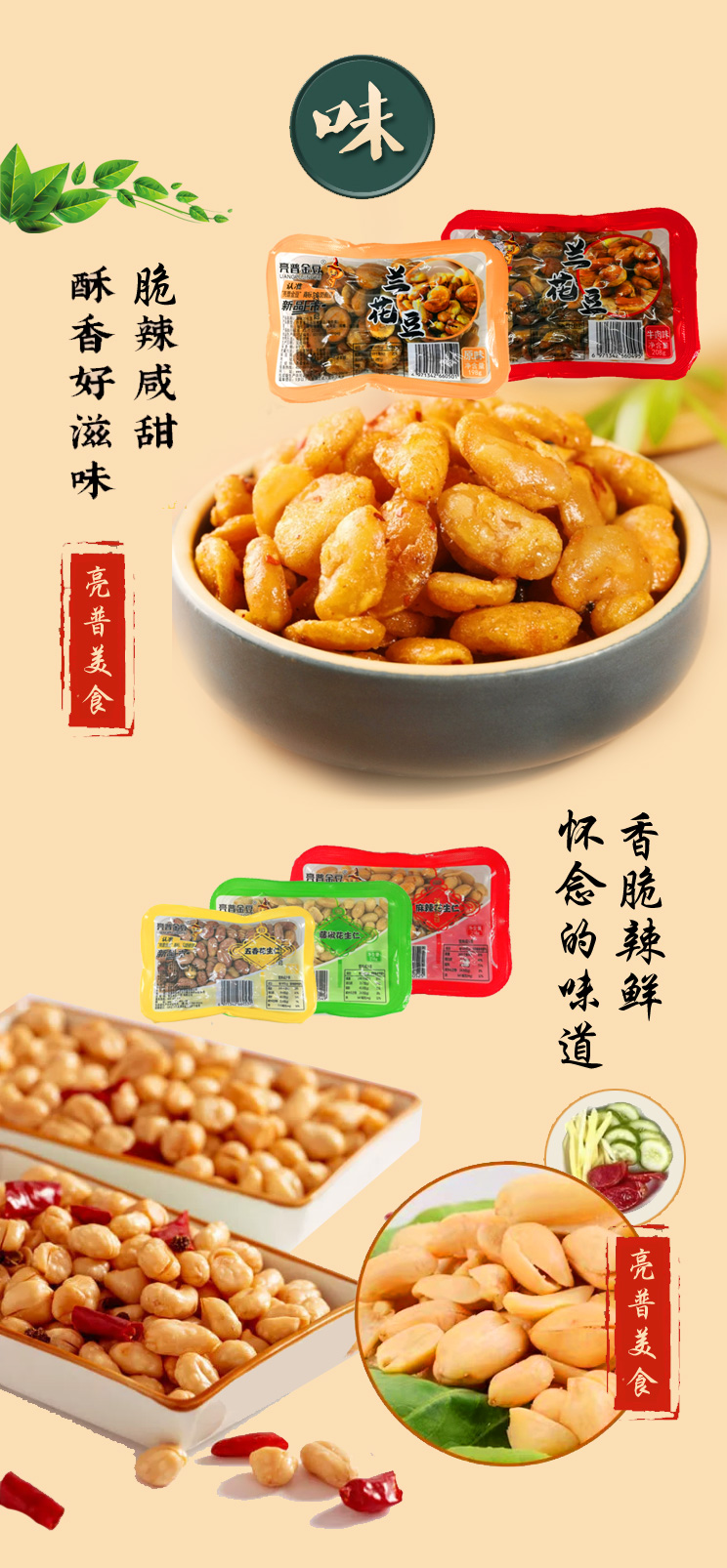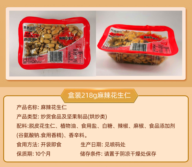 产品名称: 麻辣花生仁 产品类型: 炒货食品及坚果制品(烘炒类) 配料:脱皮花生仁、植物油、食用盐、白糖、辣椒、麻椒、食品添加剂 (谷氨酸钠.食用香精)、香辛料。 食用方法: 开袋即食 生产日期: 见喷码处 保质期: 10个月 储存条件: 请置于阴凉干燥处保存