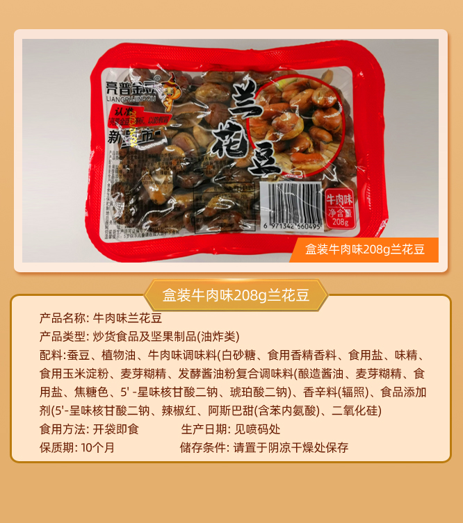 产品名称: 牛肉味兰花豆 产品类型: 炒货食品及坚果制品(油炸类) 配料:蚕豆、植物油、牛肉味调味料(白砂糖、食用香精香料、食用盐、味精、食用玉米淀粉、麦芽糊精、发酵酱油粉复合调味料(酿造酱油、麦芽糊精、食用盐、焦糖色、5' -星味核甘酸二钠、琥珀酸二钠)、香辛料(辐照)、食品添加剂(5'-呈味核甘酸二钠、辣椒红、阿斯巴甜(含苯内氨酸)、二氧化硅) 食用方法: 开袋即食 生产日期: 见喷码处 保质期: 10个月 储存条件: 请置于阴凉干燥处保存