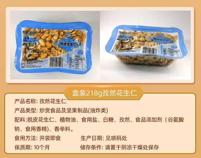 产品名称: 孜然花生仁 产品类型: 炒货食品及坚果制品(油炸类) 配料:脱皮花生仁、植物油、食用盐、白糖、孜然、食品添加剂(谷氨酸钠、食用香精)、香辛料。 食用方法: 开袋即食 生产日期: 见喷码处 保质期: 10个月 储存条件: 请置于阴凉干燥处保存